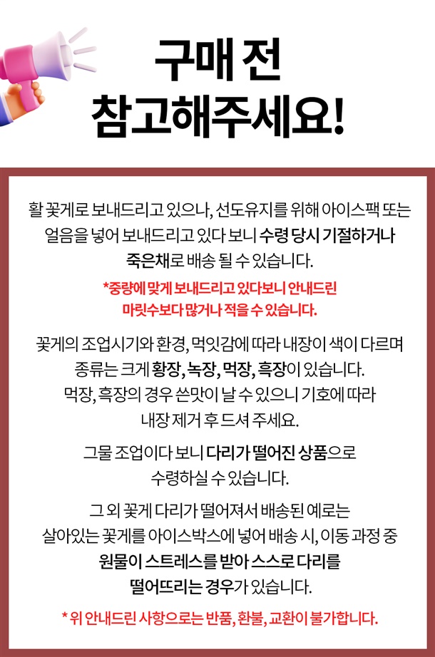 · 변질. 파손 등 수령하신 상품에 문제가 있을 경우 드시지 마시고 받으신 상품의