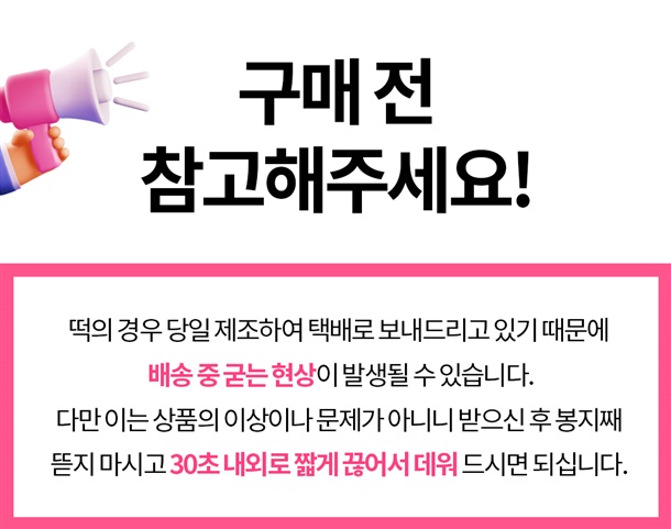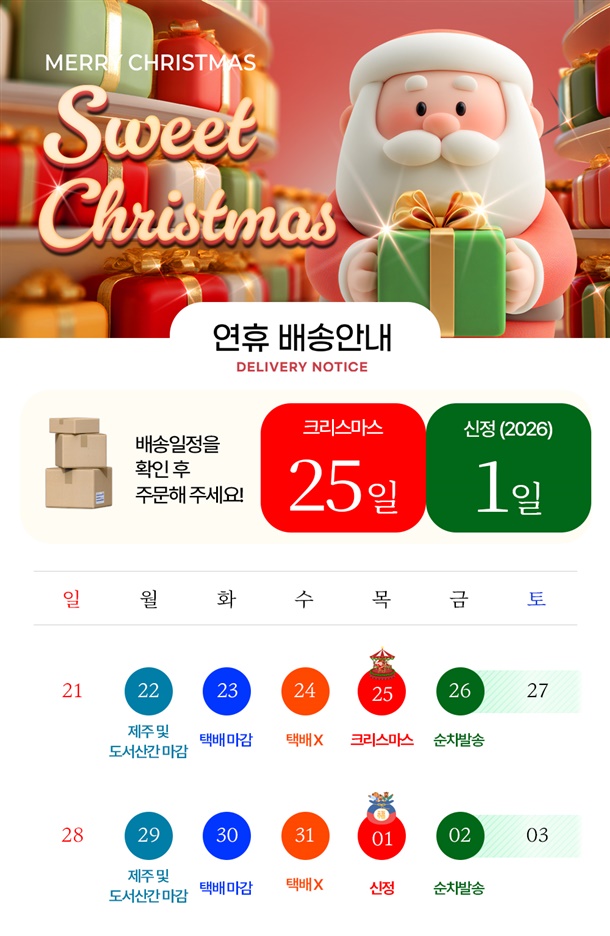 · 배송일은 평일 기준 2~3일 소요될 수 있으며 주문 폭주 또는 기상악화로 인한 배송 지연이 있을 수 있습니다.