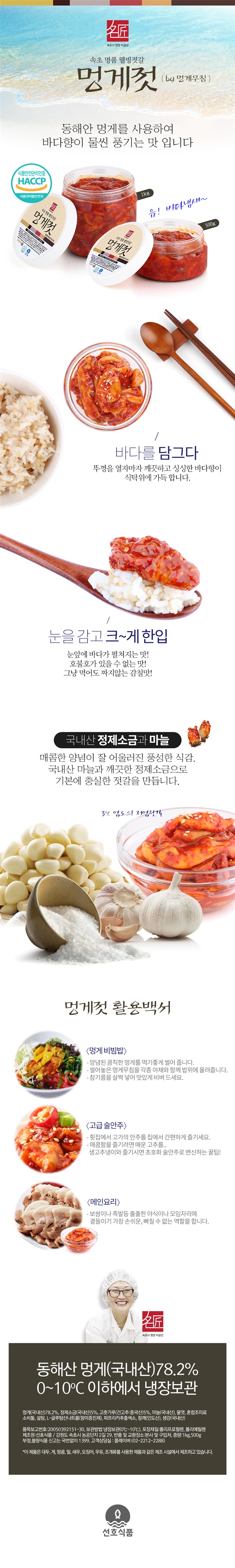 | 원재료 및 함량 | 멍게(국내산(78.2%),정제소금(국내산)5%,고춧가루(건고추:중국산)5%,마늘(국내산),물엿,혼합조미료,소비톨,설탕,L-글루탐산나트륨(향미증진제),파프리카추출색소,참깨(인도산),생강(국내산) |