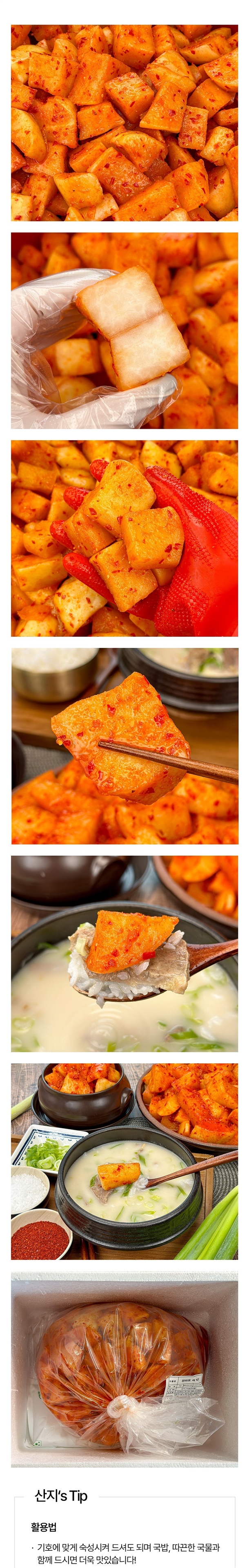 | 원재료 및 함량 | 절임무81%(국산), 정제수6.4%, 고춧가루3.04%(건고추:국산), 무2.8%(국산) 알파미분(쌀:국산), 새우젓(새우:국산), 마늘(국산), 양파(국산), 멸치젓(멸치:국산) 멸치액젓(멸치:국산), 요리엿, 천일염(국산), 다시마분말(다시마:국산) |