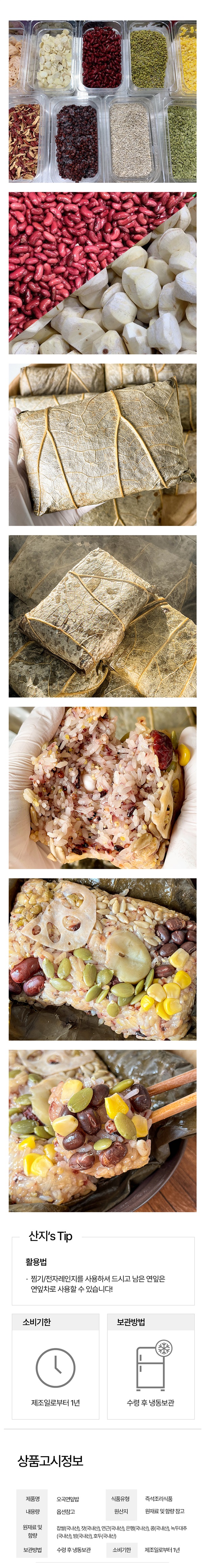 | 원재료 및 함량 | 찹쌀(60%,국산),수수(8%,국산),찰기장(8%,국산),찰흑미(8%,국산),깐밤(3%,국산),덩굴강낭콩(4%,국산),건조대추(국산),해바라기씨앗(국산),연근(국산),호박씨앗(국산) |