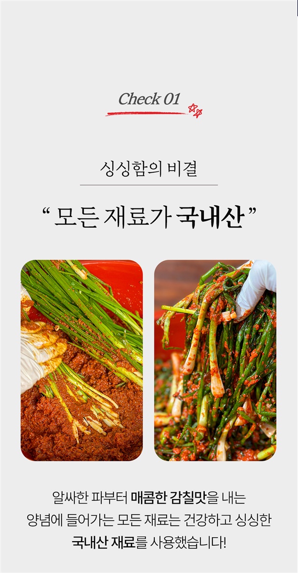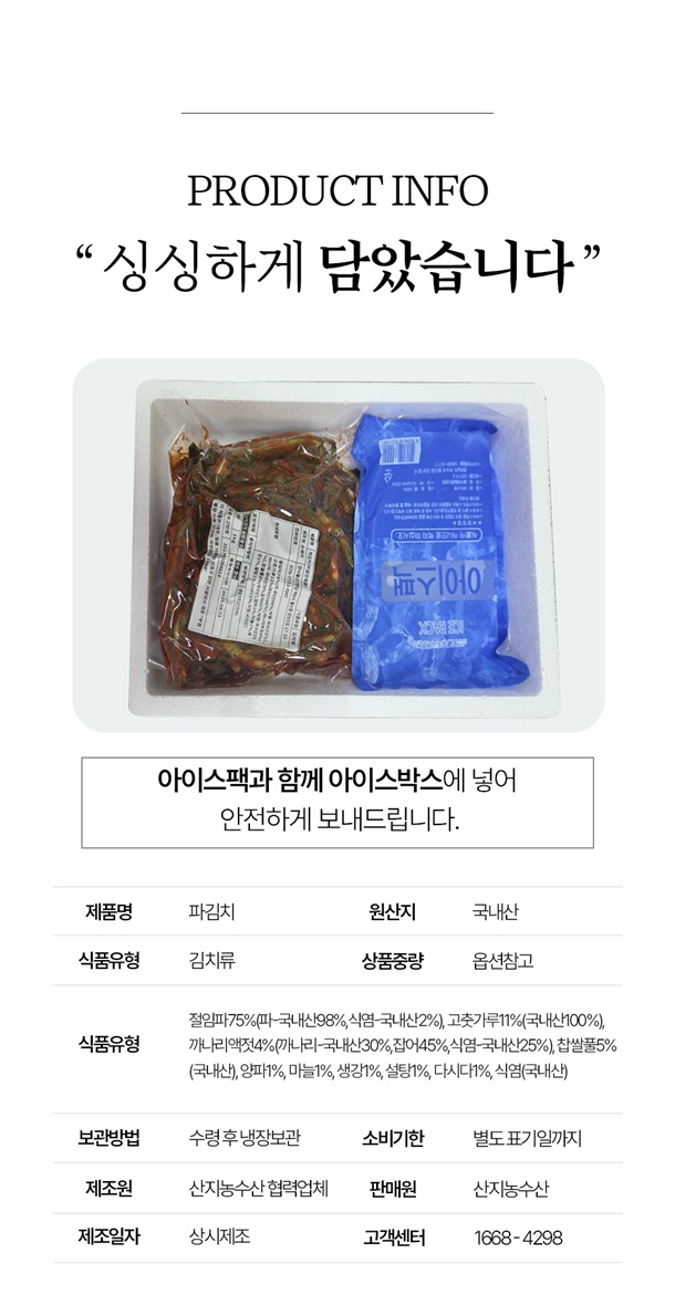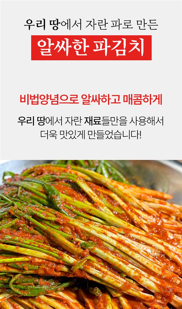 원재료 및 함량 절임파75%(파-국내산98%,식염-국내산2%), 고춧가루11%(국내산100%), 까나리액젓4%(까나리-국내산30%,잡어45%,식염-국내산25%), 찹쌀풀5%(국내산), 양파1%, 마늘1%, 생강1%, 설탕1%, 다시다1%, 식염(국내산)