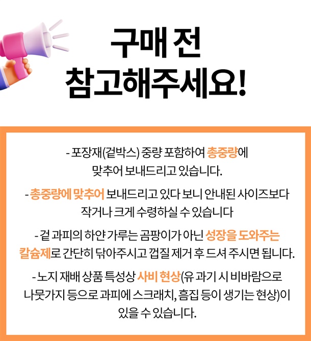 · 생물, 수산물 등은 이동과정 중 대사작용으로 10~20%내외의 자연감량이 있을 수 있습니다.