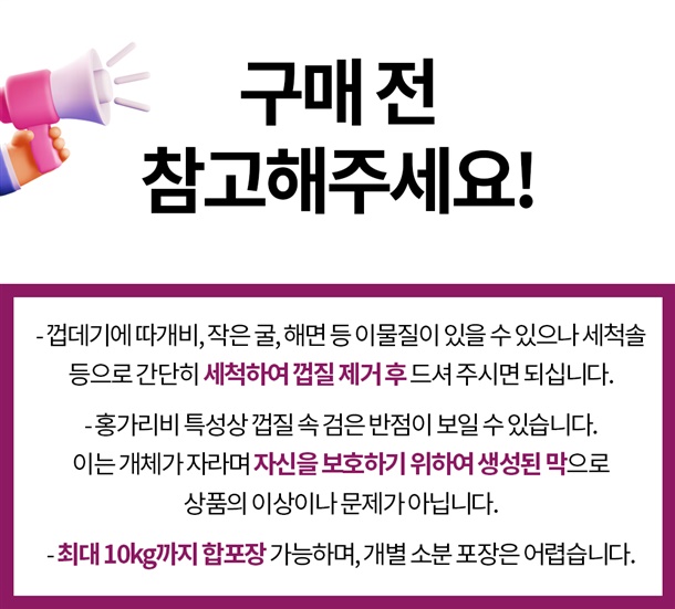 · 개인의 기호에 따라서 맛이나 식감, 향 등은 다르게 느낄 수 있는 부분이므로, 이로인한 교환/반품이 불가 합니다.