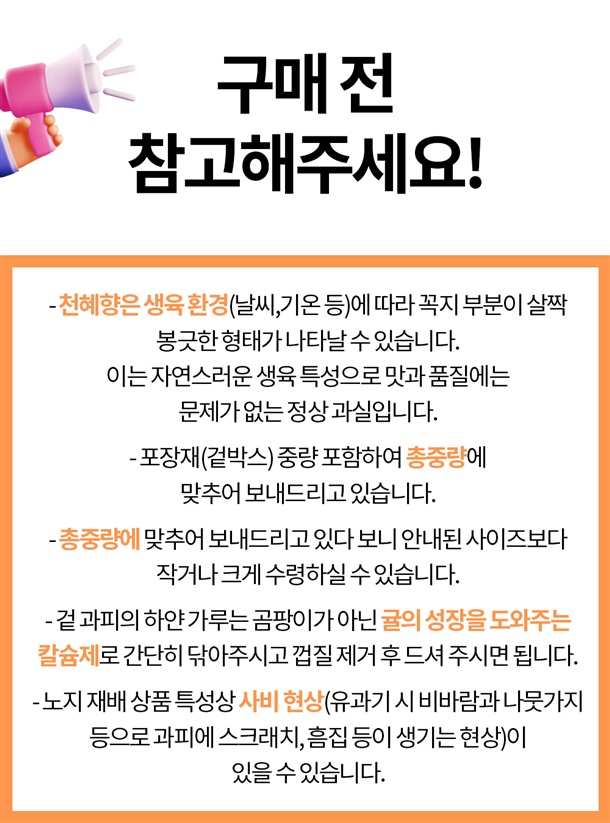 · 신선식품 특성상 단순변심 또는 상품의 가치가 현저히 감소할 경우, 교환/반품이 불가합니다 .