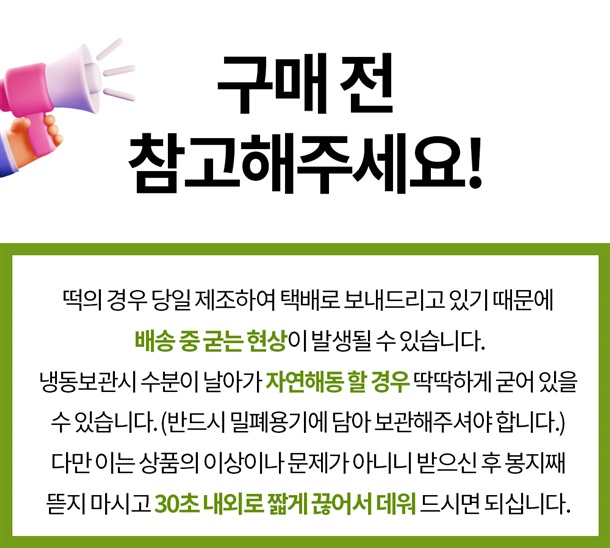 · 냉동제품이 녹아 도착하더라도 걱정하지마세요, 받으신 즉시 재냉동 후 드시어 주시면 됩니다