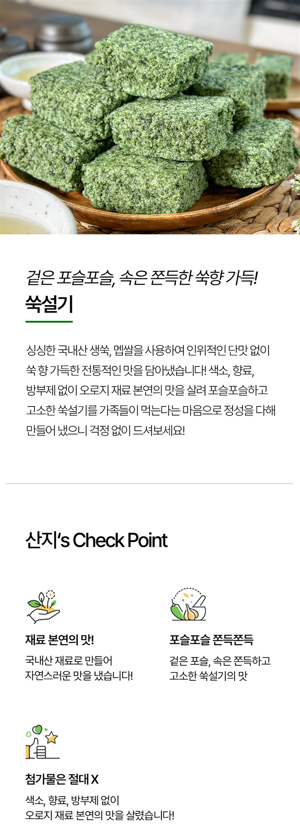 멥쌀(국내산)55.52%,쑥(국내산)33.31%,정제수5.55%,소금(천일염)0.06%,설탕5.55%