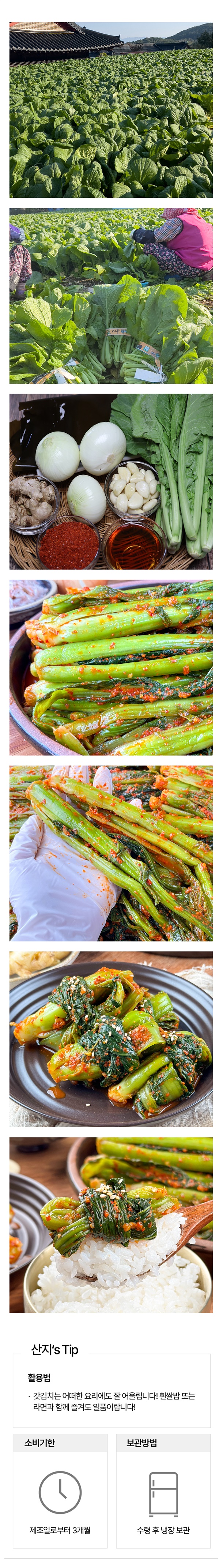 원재료 및 함량 갓 65%(국내산), 양념 35%[고춧가루 30%(국내산)마늘 1%, 양파 2%, 생강 0.5%, 설탕1%,천일염 0.8%다시마육수 49%, L-글루탐산나트륨 0.2%풀죽 14%, 액젓 1.5%]
