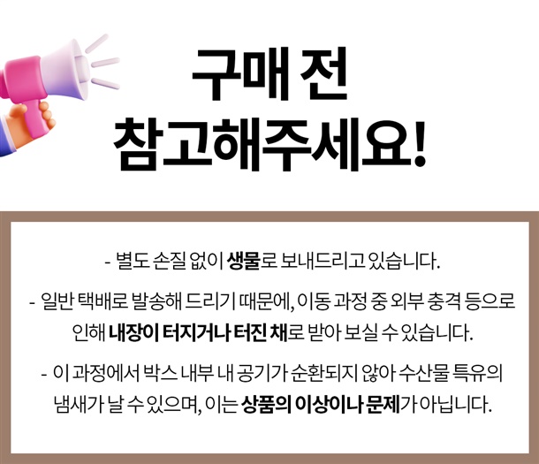 · 생물, 수산물 등은 동과정 중 대사작용으로 10~20%내외의 자연감량이 있을 수 있습니다.