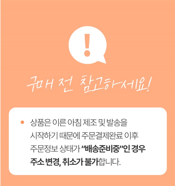 · 배송은 평일 기준 2~3일 소요될 수 있으며 주문폭주,기상악화로 배송지연이 있을 수 있습니다.